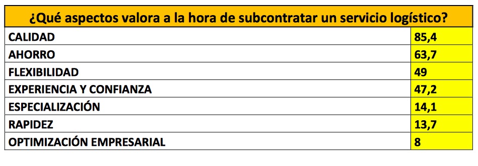 La calidad sigue siendo el aspecto más valorado por los directores de logística de las empresas industriales españolas a la hora de subcontratar un servicio logístico con un 85,4 %. Esta cifra sufre un aumento muy significativo con un 9,9 % más que el año anterior, con lo que la calidad aventaja en más de un 20 % al segundo aspecto más valorado que sigue siendo el ahorro, con un 63,7 %.Otro aspecto muy valorado entre los cargadores es la flexibilidad que le puede proporcionar la subcontratación de un servicio logístico (49 %). La flexibilidad pierde un 3 % de adeptos respecto al estudio del año pasado.Otros de los aspectos que valoran los directores de logística a la hora de subcontratar servicios logísticos son la experiencia y la confianza en el proveedor (47,2 %), la especialización (14,1 %), la especialización (14,5 %), la rapidez (13,7 %) y la optimización empresarial (8 %).