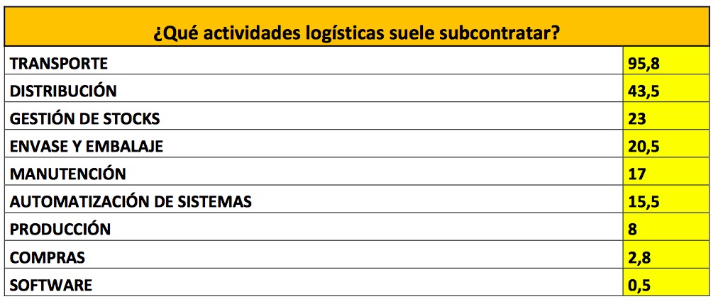 Entre las actividades logísticas más subcontratadas destaca, como ya viene siendo habitual en los anteriores Barómetros del Círculo Logístico, el transporte. Un 95,8 % de los 776 directores de logística que han participado en el V Barómetro Círculo Logístico SIL 2014 afirma que subcontrata los servicios del transporte de su empresa. Este porcentaje es casi cinco puntos mayor al registrado en 2013 y cerca de ocho puntos mayor al registrado en 2012, con lo que sigue al alza. El transporte es el líder indiscutible de esta categoría ya que se sitúa a gran distancia de la segunda actividad más externalizada que es la distribución con un 43,5 %. La distribución sufre un descenso del 7 % con respecto al Barómetro de 2013.