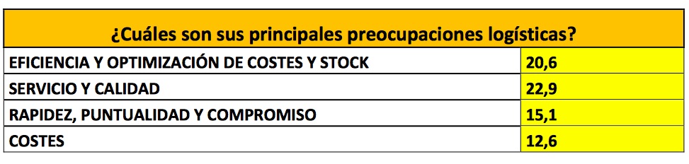 Completan el ranking de principales actividades logísticas externalizadas por las empresas la producción (8 %), las compras (2,8 %) y el software (0,5 %), este último aspecto aparece por primera vez en este apartado. el 100 % de las empresas cargadoras españolas que han participado en el V Barómetro del Círculo Logístico SIL 2014 afirma subcontratar alguna actividad logística.El servicio y la calidad se colocan en primer lugar como la principal preocupación de los cargadores españoles. Un 22,9 % de los directores de logística que han participado en este estudio señalan el servicio y la calidad como principal preocupación, cifra que se ve incrementada en un 2,9 % respecto al Barómetro de 2013. En segundo lugar encontramos la eficiencia y la optimización de costes y stocks con un 20,6 %. A pesar que esta cifra se incrementa un 0,6 % respecto al estudio del año pasado, la eficiencia y la optimización de costes y stocks baja hasta la segunda posición.Otra preocupación logística que crece de forma importante este año es la rapidez, la puntualidad y el compromiso que sube de la cuarta hasta la tercera posición con un 15,1 %, cifra que aumenta un 1,3 %. Recorre el camino inverso (de la tercera a la cuarta posición) los costes con un 12,6 %. Esta preocupación de los logísticos disminuye un 5,2 % respecto a 2013.