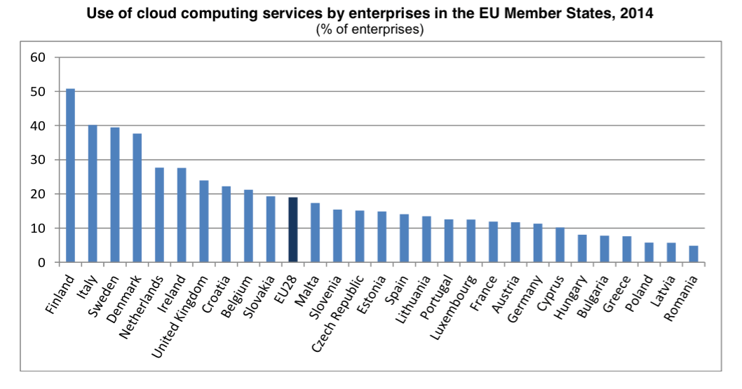 Although the share of firms with internet access was at very similar high levels across Member States, only a fifth (19%) used cloud computing services in 2014. Not surprisingly, the largest proportion of enterprises in the EU28 using the cloud was by far recorded in the information & communication sector (45%), followed by the sector covering professional, scientific and technical activities (27%), while the share ranged from 14% to 20% in all other economic sectors. Enterprises relied on a cloud solution mainly for their e-mail services (66%) and for file storage (53%). Those enterprises using cloud services reported that the risk of a security breach was the main factor limiting a larger use of the cloud. For the remaining 81% of the enterprises not using the cloud, the insufficient knowledge of cloud computing was considered as the main blocking factor. These data come from a publication issued by Eurostat, the statistical office of the European Union, and form part of the results of a survey conducted at the beginning of 2014 on ICT (Information and Communication Technologies) usage in enterprises, with a special focus on the use of cloud computing services.Half of enterprises use cloud computing services in Finland.