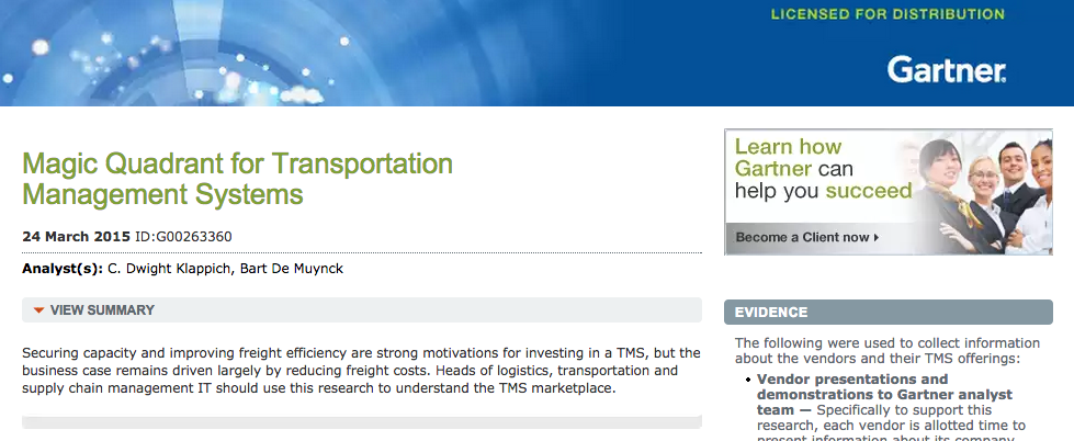 Barcelona, 6 May 2015.-  The prestigious technology research firm juncture, Gartner has published a recent analysis of the TMS market. The following is his definition of TMS, main features, benefits and returns to a carrier or a logistics operator. We recommend a thorough reading of this report, whose precise reading of facilitating a series of contact. We would like your assessment and review, if fully agrees with the view of Gartner or the market, company by company, draw another picture. We invite you to give us your opinion at the end of the article in this blog, or our twitter:@softlogistico. Thank you.