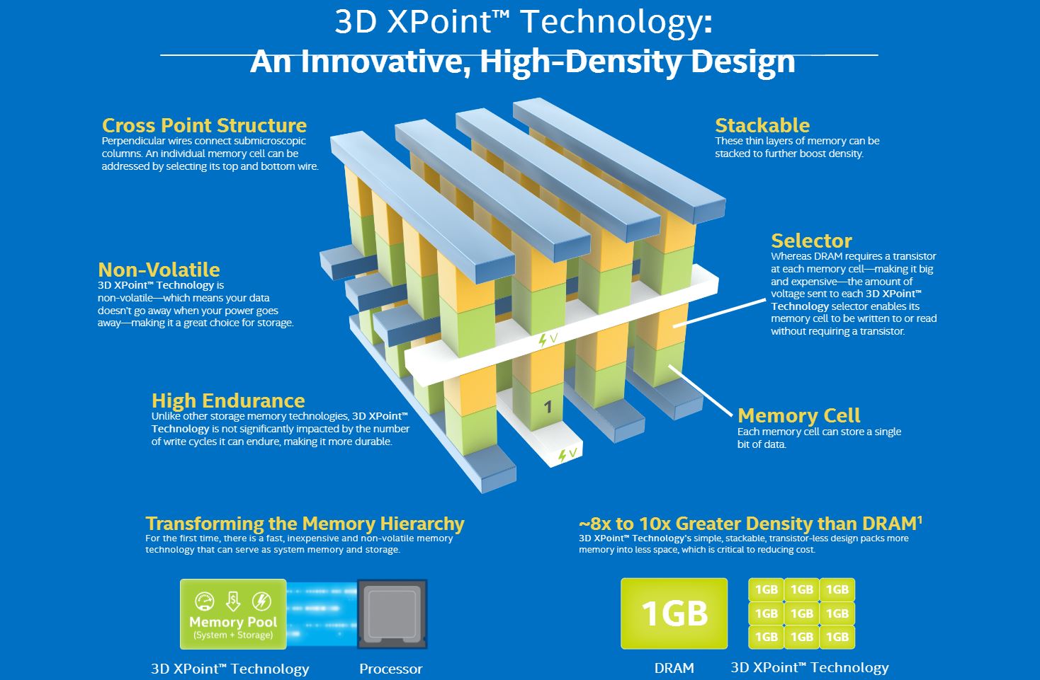 The technology, which they’re calling 3D XPoint, also has 1000 times higher endurance — it will last far longer — and is 100 times denser, hence will store more data, than conventional memory storage. It’s the first new type of memory technology to come along in more than 25 years, the companies said. The technology is intended to give processors faster access to giant sets of data on a variety of computing devices. “It is fundamental game changer that will enable companies to do new things with it,” said Rob Crooke, senior vice president and general manager of Intel’s Non-Volatile Memory Solutions Group, at a San Francisco event Tuesday morning. “It will enable us to scale computing even further. When we scale processing performance, memory and data can scale with it.”