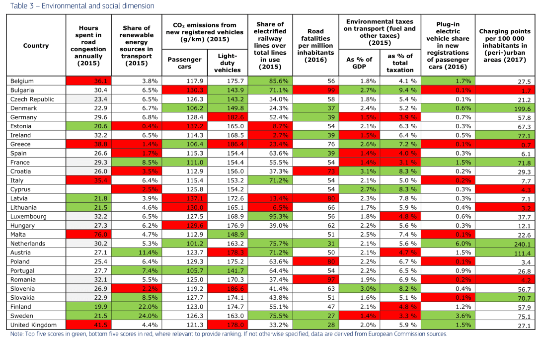 Given the regional specificities and differences in transport patterns, a possible indicator to compare the situation among the EU countries is the index of satisfaction with transport infrastructure quality. It is produced by the World Economic Forum for its Global Competitiveness Report (see Figure 5). It points out that the overall satisfaction with transport infrastructure is the lowest in the Central and Eastern European countries, namely Bulgaria, Poland, Romania, Slovakia and Slovenia, but Greece and Malta also score rather poorly. In contrast, Germany, Spain, Finland, France and the Netherlands rank the highest.