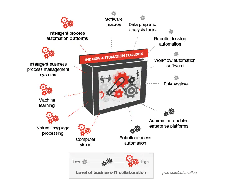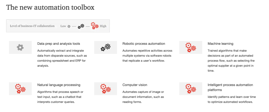 Intelligent automation quietly incorporates an ecosystem of technologies. Many companies, for example, use customer service chatbots on their websites. Such chatbots often start with rule-based automation and natural language processing but are later fortified with additional cognitive understandings of sentiment. Similarly, when insurance companies send drones to recognize the damage to rooftops after a hurricane, they can optimize machine learning image recognition models as an essential step to quick claims adjustment and payout.