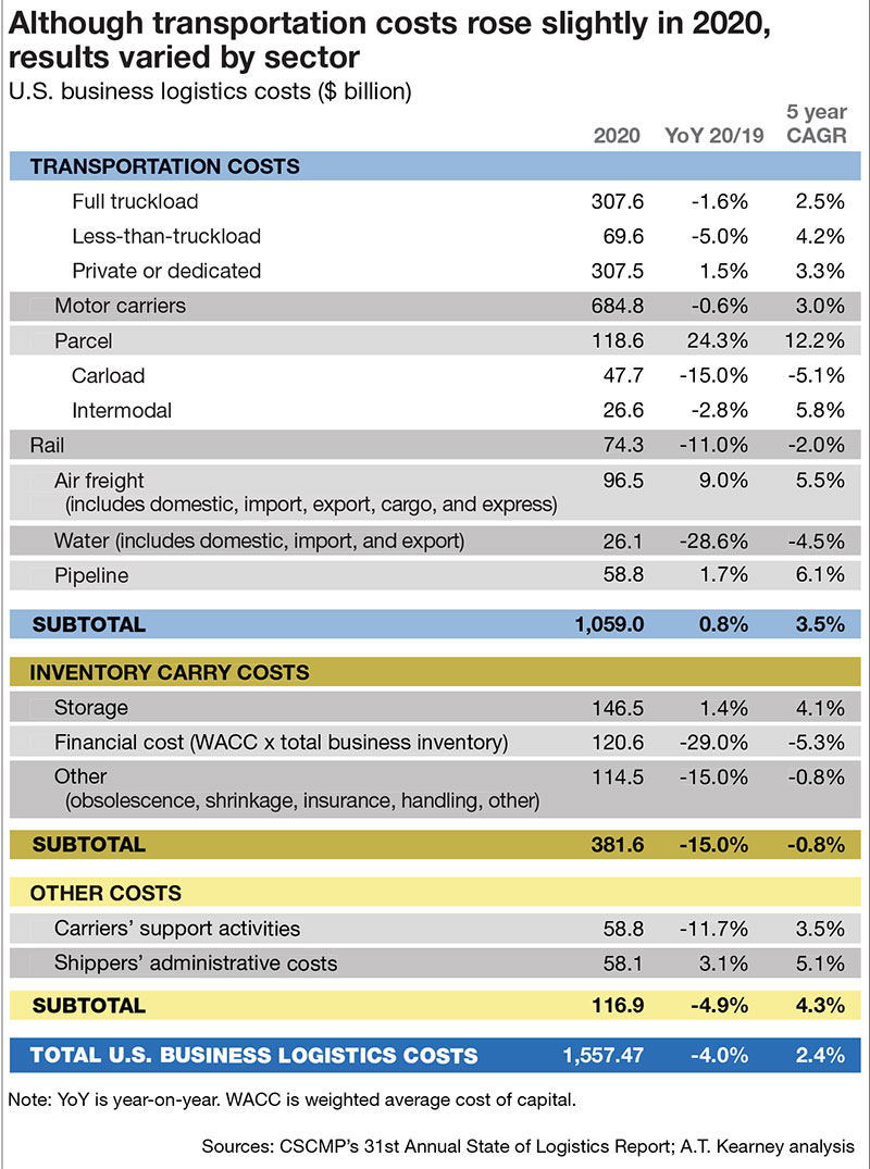 Trucking, the biggest segment of U.S. logistics spending, fell slightly for the year 2020. But a fourth-quarter recovery suggests that continued economic growth would keep rates high through 2021—until new trucks and drivers can increase available capacity. However, despite industry efforts to bring more capacity into the market, the report authors contend that it still won’t be enough to bring truck rates down in 2021.
